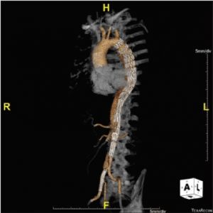Malperfusion of aortic branches and aortic rupture are the two most feared complications in the acute phase of a type B aortic dissection. When such complications occur, stent graft deployment should be considered with the proximal landing zone in a healthy, nondissected aorta.1-3 The coverage of the main proximal intimal tear redirects the aortic flow toward the true lumen and thus promotes a drop of pressure within the false lumen. Thoracic stent grafting (TEVAR) has been associated with encouraging early outcomes for the treatment of acute complicated type B aortic dissection,4,5 but questions still remain regarding the mid- and long-term results.6 Initial successful treatment with TEVAR is not necessarily associated with favorable remodeling of the dissected aorta during follow-up.7 Only few exhaustive anatomical analyses of the aorta following TEVAR for acute type B aortic dissection have been performed so far.7-11 TEVAR generally induces positive aortic remodeling, but this is usually limited to the aortic segment covered by the stent graft; frequently, the outcomes of the distal thoracic and abdominal aorta remain of concern.12