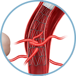 Figure 3. In the latter case, despite good reexpansion of the true lumen after the deployment of a composite device design, residual static malperfusion of the right common iliac artery required additional stenting.