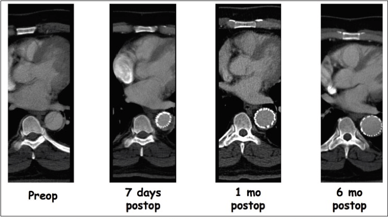 Figure 1. A patient with acute complicated type B aortic dissection was treated with a composite device design (stent graft and bare stent). Successive CTAs showing remodeling of the thoracic aorta, including expansion of the true lumen and thrombosis of the false lumen.