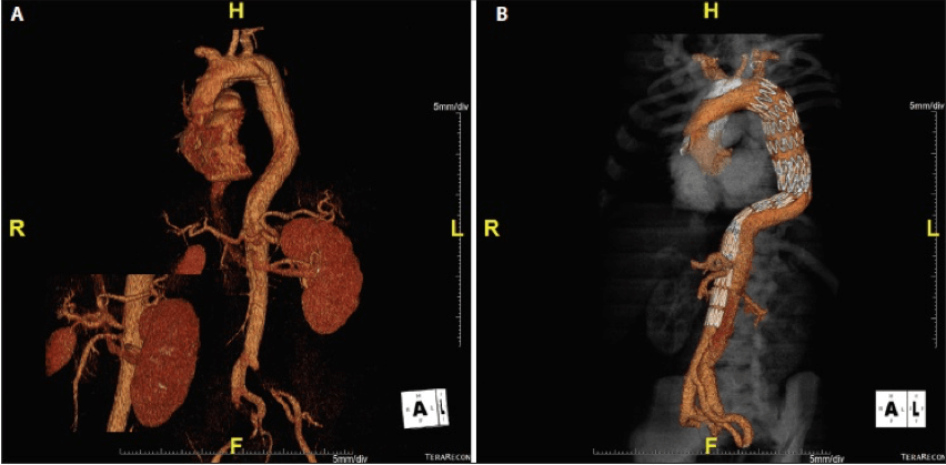 Figure 2. A patient presented with acute type B aortic dissection complicated with visceral and lower limb malperfusion (preoperative CTA)(A). The postoperative CTA showed that the use of a composite device design promoted sufficient true lumen expansion to correct the malperfusion syndrome without additional selective stenting or fenestration (B). At this early stage, the distal false lumen was still patent.